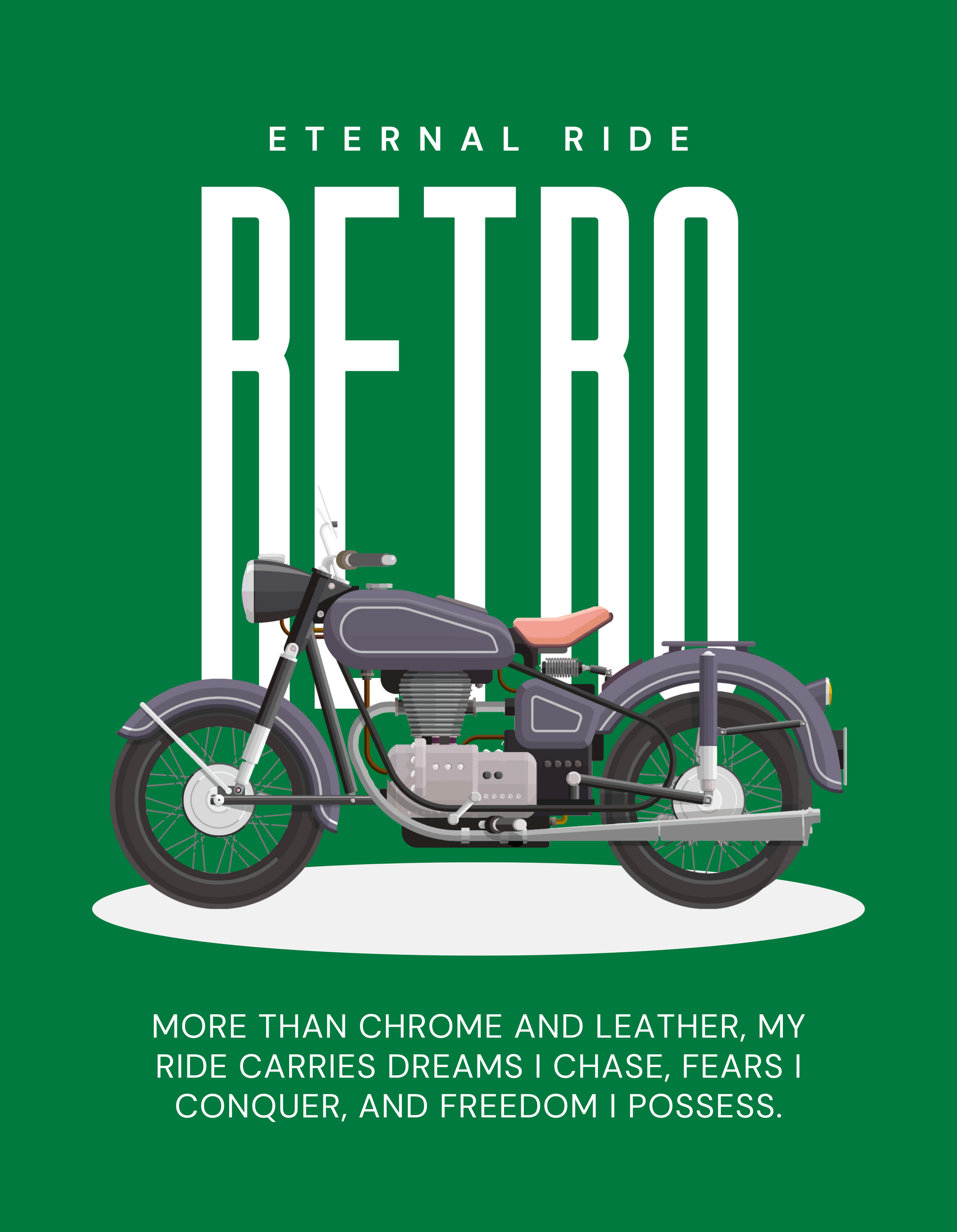 Showcases a retro bike graphic paired with a timeless quote, evoking a sense of adventure and vintage spirit.